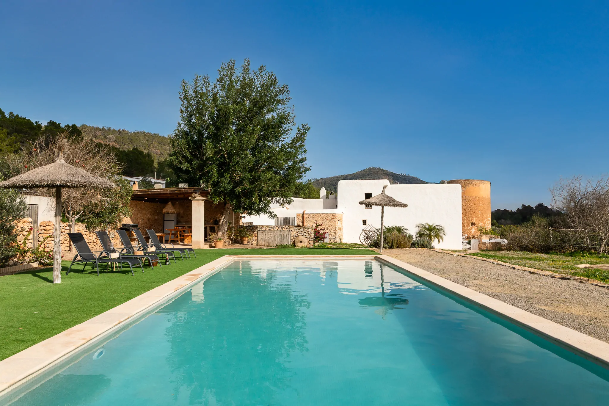 En el exterior, una hermosa piscina y espacios al aire libre rodeados de naturaleza invitan a los huéspedes a relajarse y disfrutar de la tranquilidad del entorno, todo ello a sólo 5 minutos en coche de la ciudad de Ibiza y del aeropuerto.