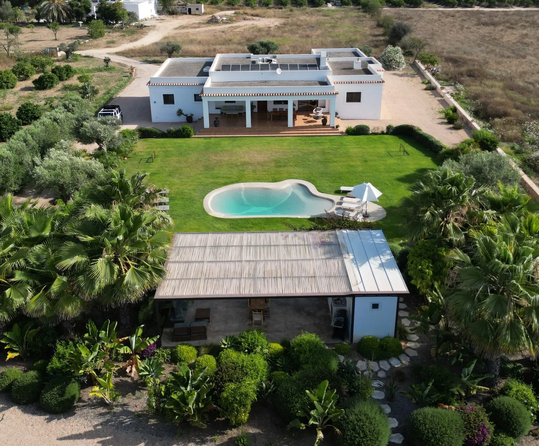 Villa Can Jaume Arabí, located in Puig D’en Valls, is an elegant and comfortable villa in Ibiza offering a peaceful and relaxing setting, ideal for a perfect Ibiza holiday. Just 7 minutes from Ibiza town centre, 6 minutes from Talamanca beach, and 11 minutes from the airport, its location is unbeatable.