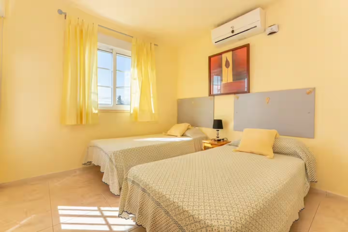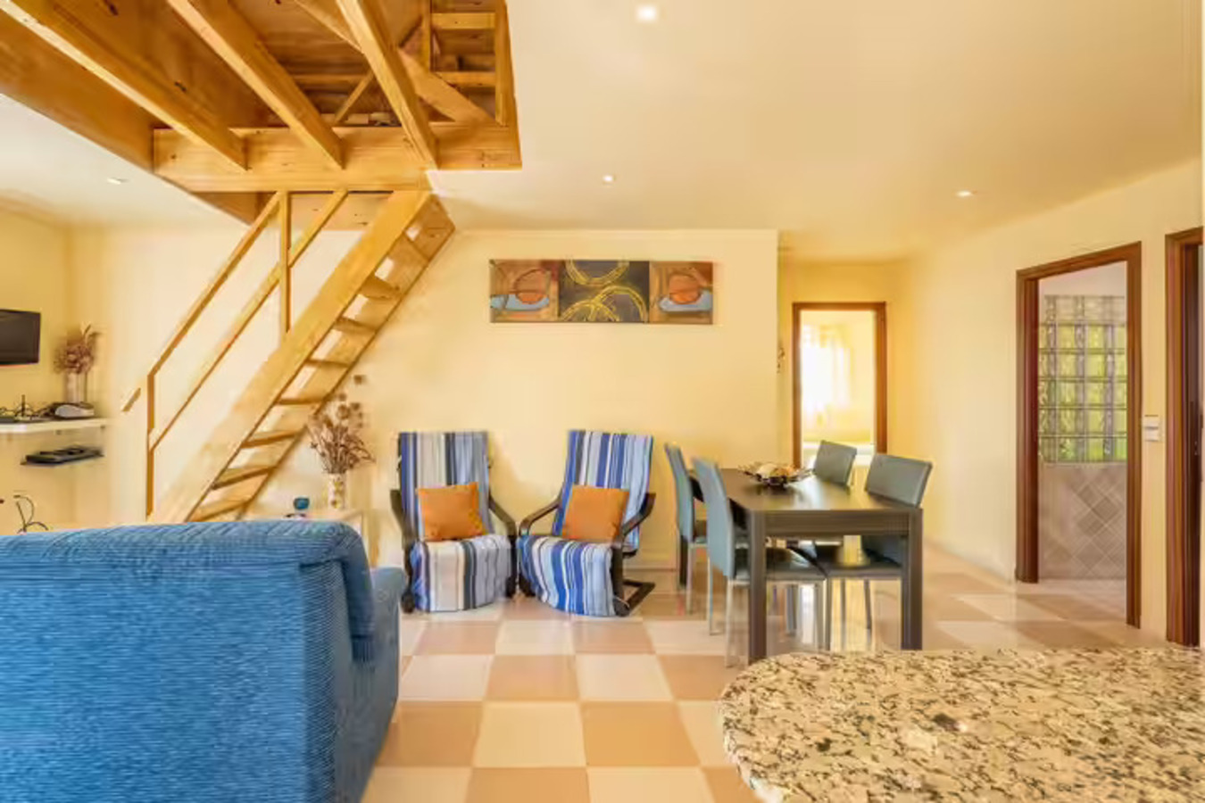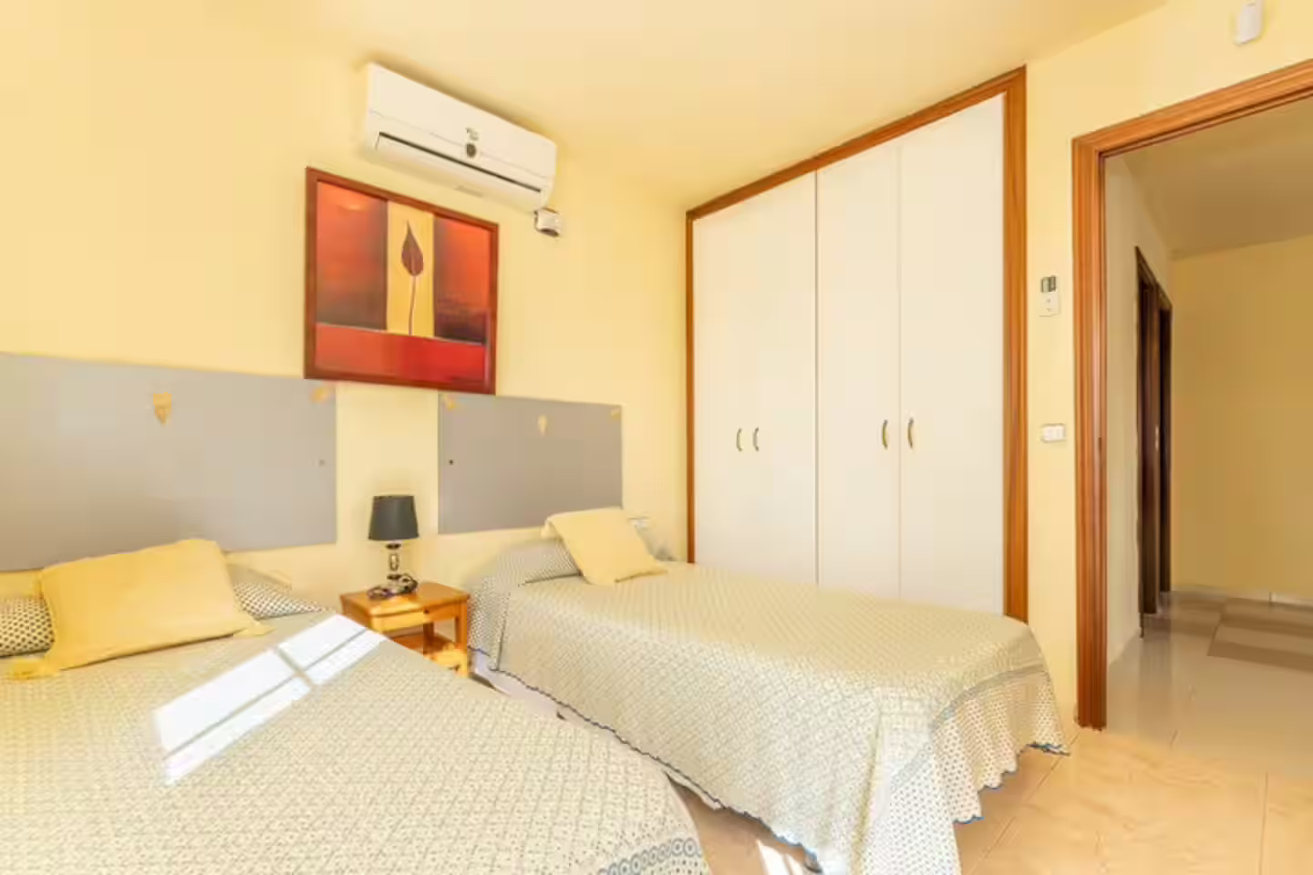 The property features a bright living room, a fully equipped kitchen, and 3 bedrooms: one with two single beds, one with a double bed, and a third with a single bed. There are also 2 bathrooms for added comfort during your stay.