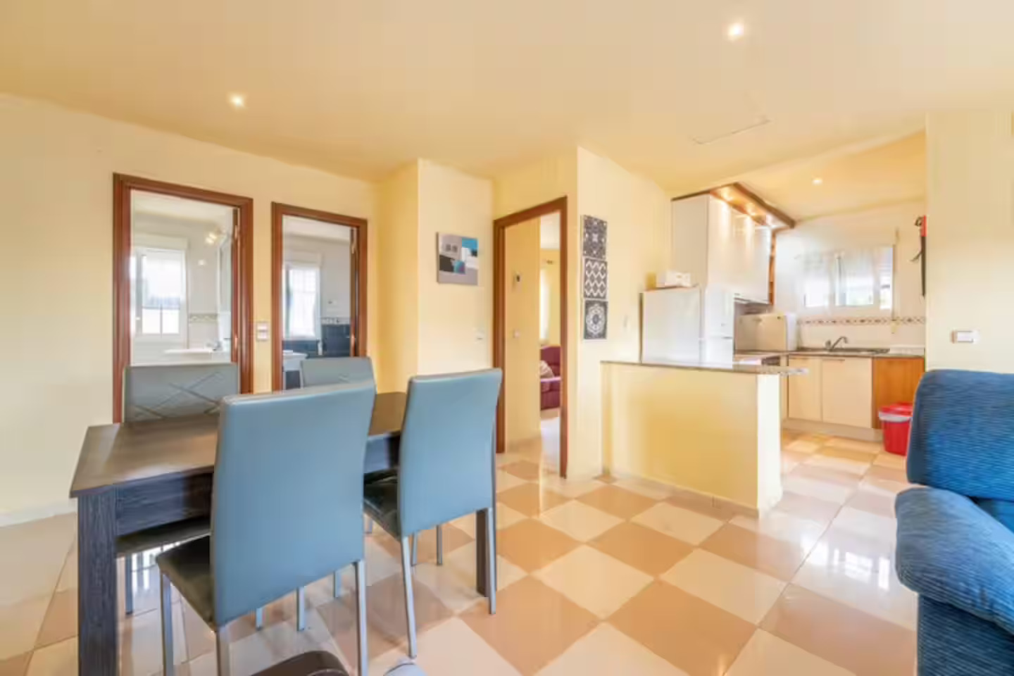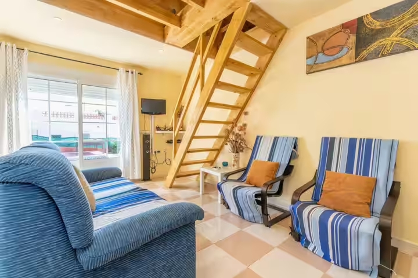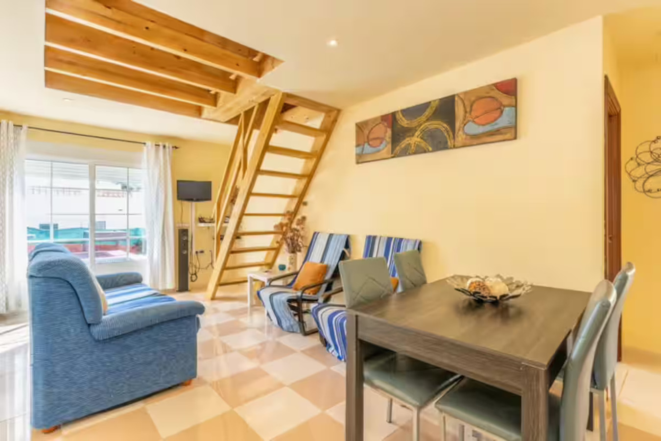 The property features a bright living room, a fully equipped kitchen, and 3 bedrooms: one with two single beds, one with a double bed, and a third with a single bed. There are also 2 bathrooms for added comfort during your stay.