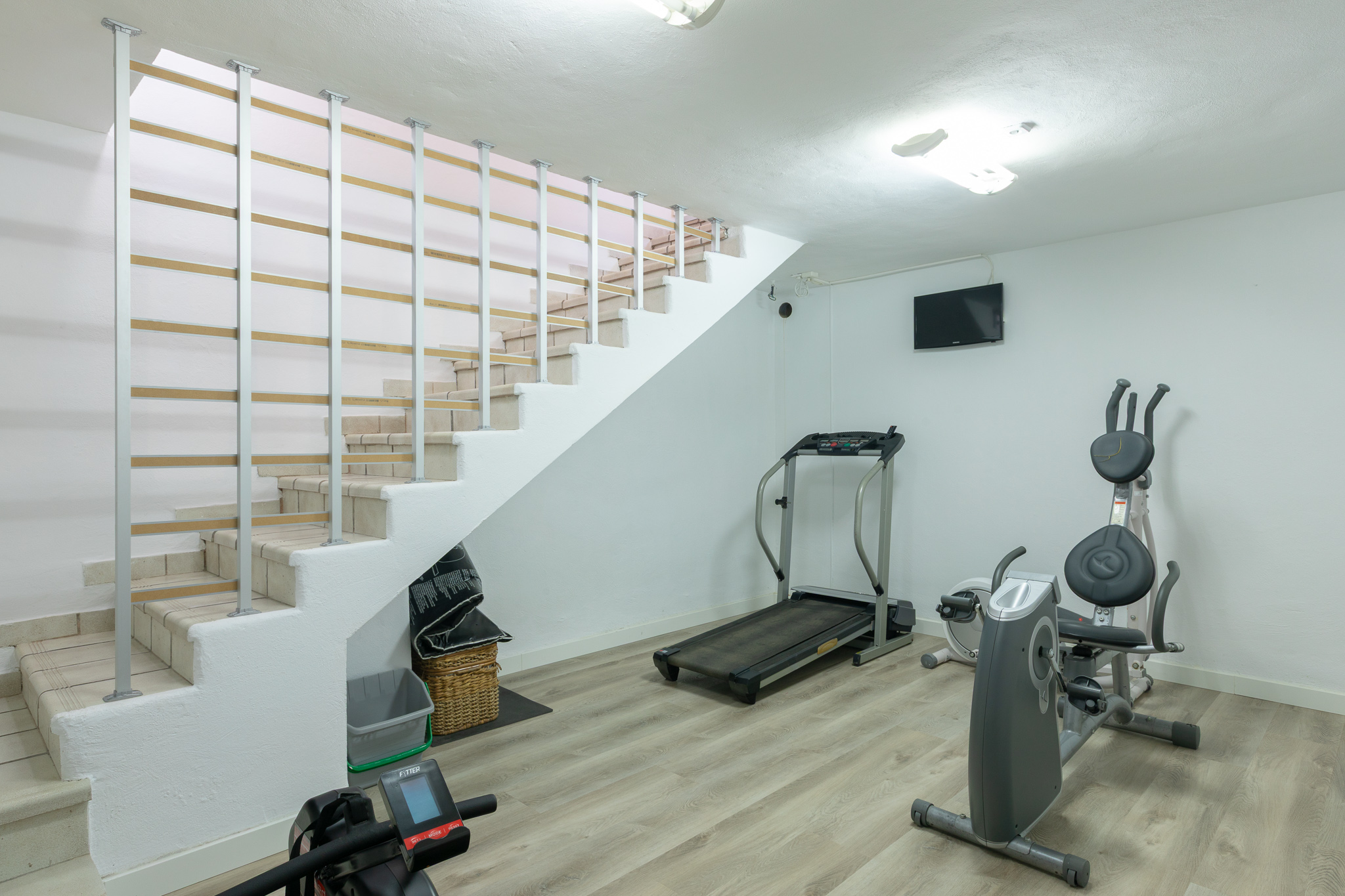 The villa features 6 bedrooms, 4 bathrooms, a stylish living room, dining area, fully equipped kitchen, and a gym room on the basement level.